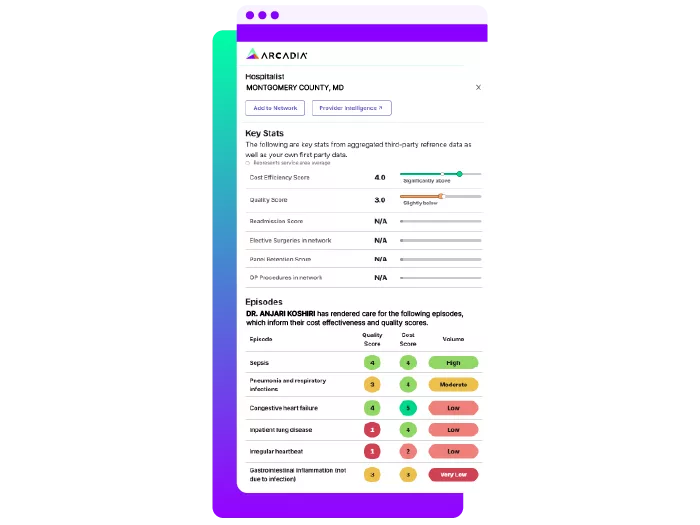 Designed for payers and providers looking to optimize their networks, understand competitive positioning, or enter a new market, Arcadia’s Network Modeler empowers teams to strategically design and manage networks with full insight. With robust clinical and claims data, market intelligence, and real-time simulations, Network Modeler delivers unmatched visibility into network performance, competitive positioning, and referral patterns — enabling faster, data-driven decisions that reduce costs, improve outcomes, and fuel growth.